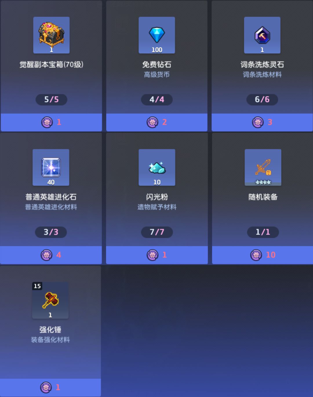 每周随机进入奖励每周可获得14次,奖励包括团队远征币和低阶宝石盒。