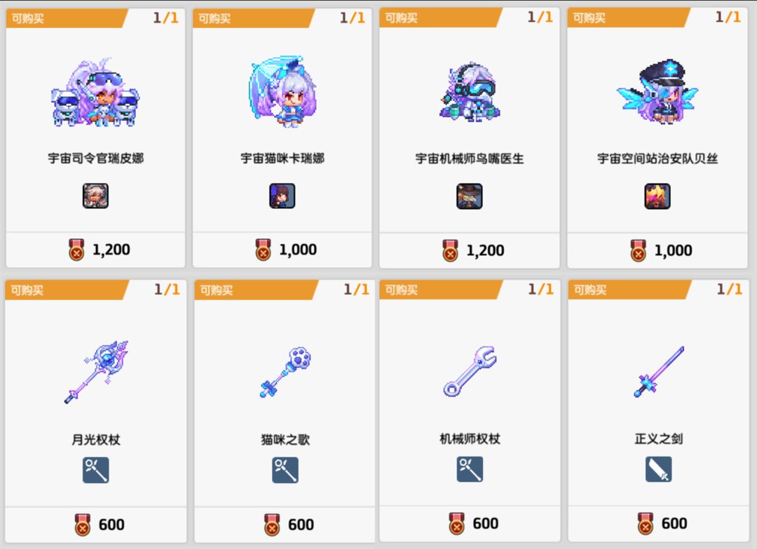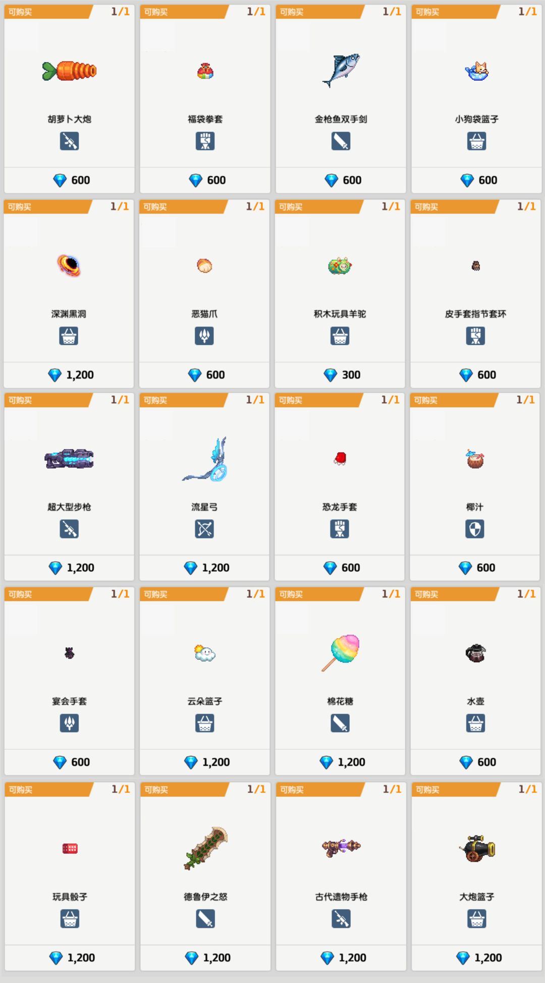装备外观:胡萝卜大炮、福袋拳套、月光权杖、猫咪之歌、机械师权杖、正义之剑、屠戮者拖把