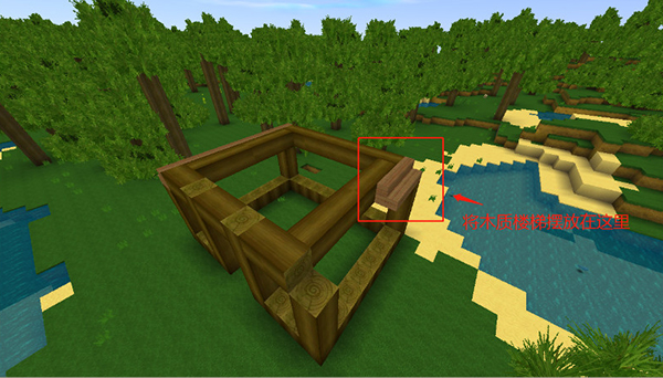 接着把做好的木质楼梯,摆放在房子框架的空格处,作为房子的屋檐——注意方向不要摆错了。