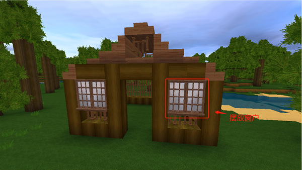 找到屋顶的中心位置,放置木质楼梯,做成一个小尖屋顶的形状。