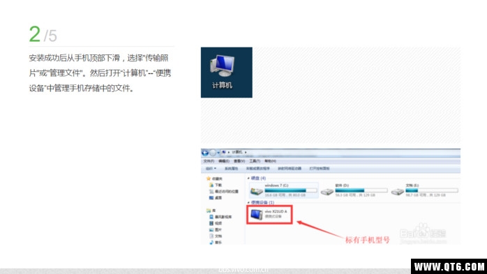 2、安装成功后从手机顶部下滑,选择"传输照片"或"管理文件"。然后打开“计算机”--“便携设备”中管理手机存储中的文件。