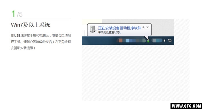 1、用USB线连接手机和电脑后,电脑会自动扫描手机,请耐心等待60秒左右(右下角会有安驱动安装提示)