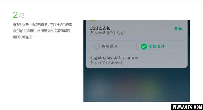 连接电脑确认是否可以看到“传输照片”和“管理文件”选项。