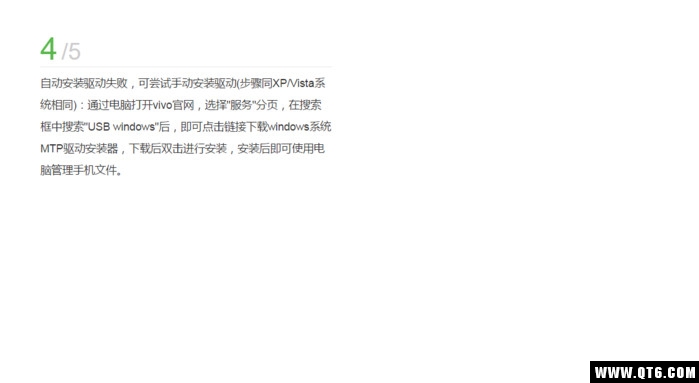 4、自动安装驱动失败,可尝试手动安装驱动(步骤同XP/Vista系统相同):通过电脑打开vivo官网,选择"服务"分页,在搜索框中搜索"USB windows"后,即可点击链接下载windows系统MTP驱动安装器,下载后双击进行安装,安装后即可使用电脑管理手机文件。