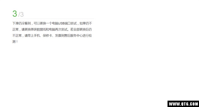 3、下滑仍没看到,可以更换一个电脑USB端口尝试,如果仍不正常,请更换原装数据线和电脑再次尝试。若全部更换后仍不正常,请带上手机、保修卡、发票到售后服务中心进行检测!