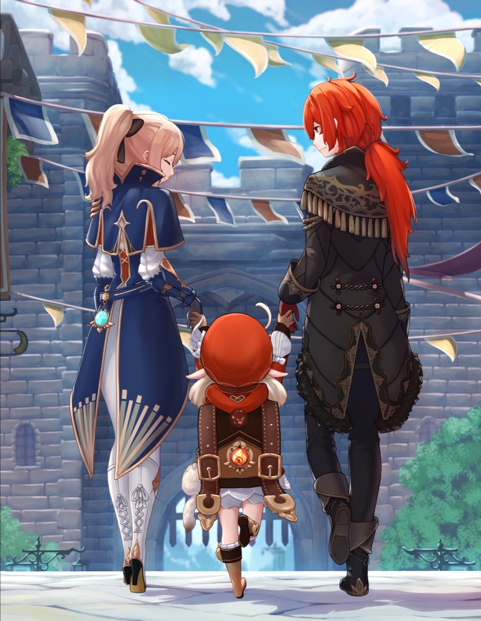 可莉,钟离或阿贝多,行秋,班尼特(钟离叔叔和阿贝多哥哥是好人,钟离叔叔的柱子很舒服,阿贝多哥哥的电梯也很舒服)
