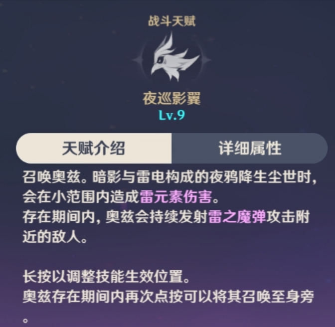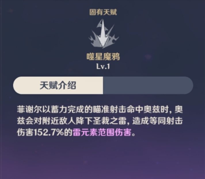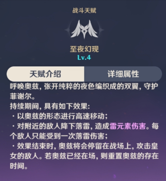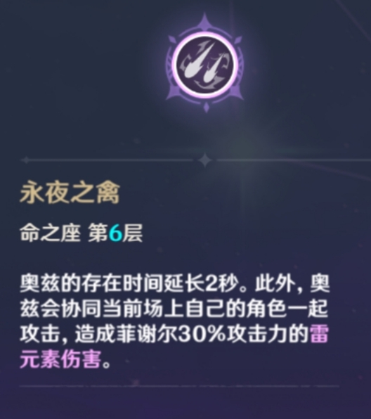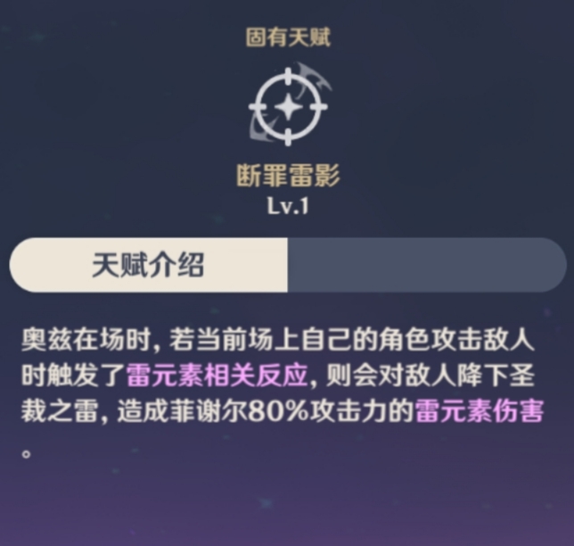 70级突破解锁,副C皇女的重要天赋技能。奥兹在于出场角色出发雷元素反应时会额外对敌人造成雷元素伤害(造成伤害条件是在场角色,像与挂后台的香菱的元素爆发触发反应就不会造成额外的伤害)。