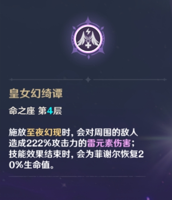 元素爆发释放时,会额外对周围的敌人造成一次雷元素伤害,结束时为皇女回复20%生命值,一定程度提升了皇女的输出,同时还为提升了皇女的续航能力。