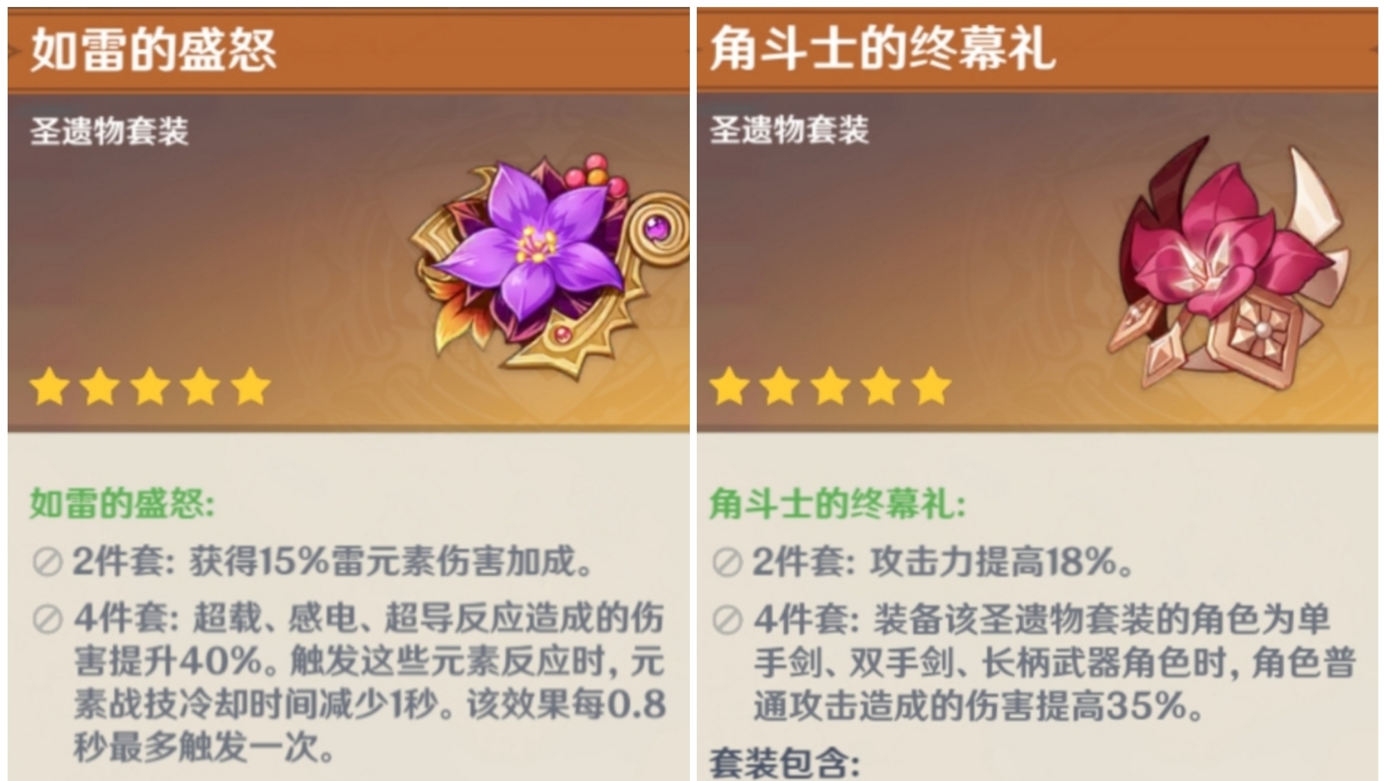 本圣遗物套装算得上是皇女的毕业套。如雷两件套提供雷伤加成,能提高奥兹伤害;角斗士两件套提高攻击力加成,提升皇女普攻与奥兹伤害。