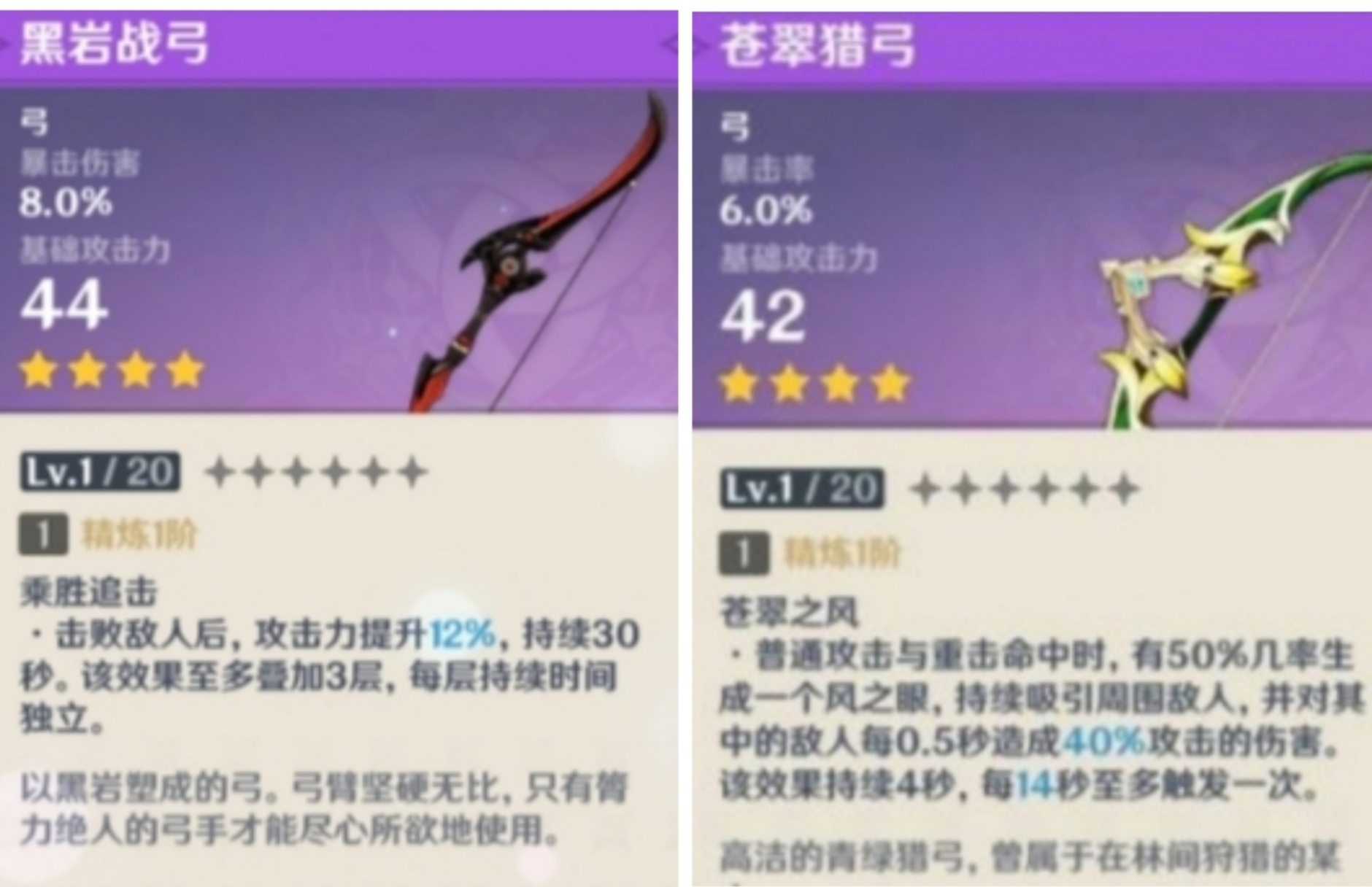 黑岩战弓与苍翠猎弓副词条分别是暴击伤害与暴击率,带这两把弓任一的话能让圣遗物更快成型。