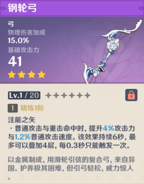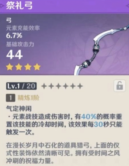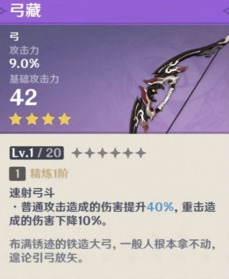 弓藏主C皇女首选四星武器,副词条为百分比天赋,对皇女的普攻伤害和奥兹伤害都有提升,特效为普通攻击伤害加成,精一就有40%,高贵的独立乘区时候速射皇女。