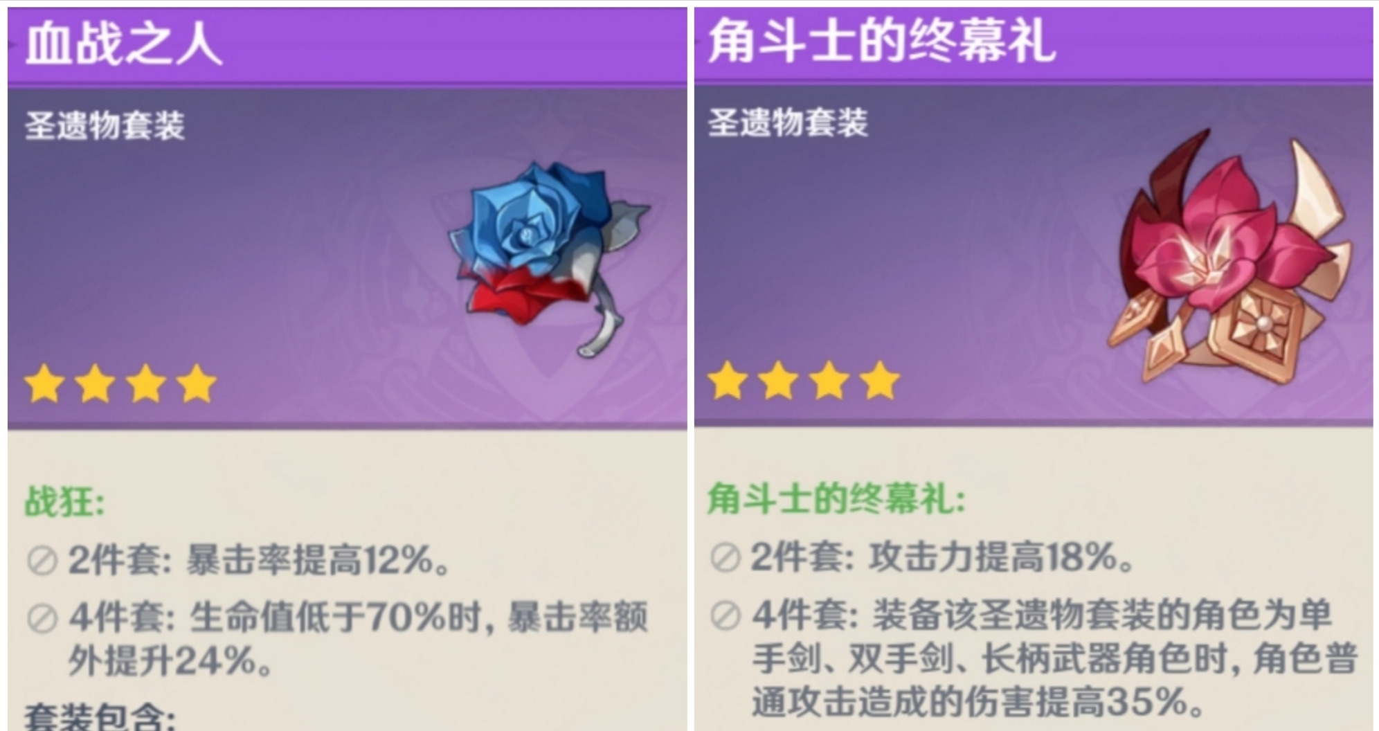 本圣遗物套装是前期过渡使用,战狂和角斗士前期打龙狼/深渊/boss就会顺便掉,获取难度低。前期会比较缺暴击,带战狂两件套可缓解这一状况。
