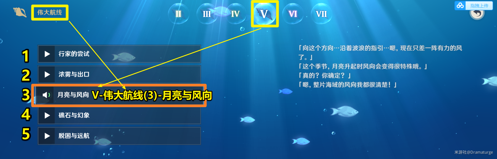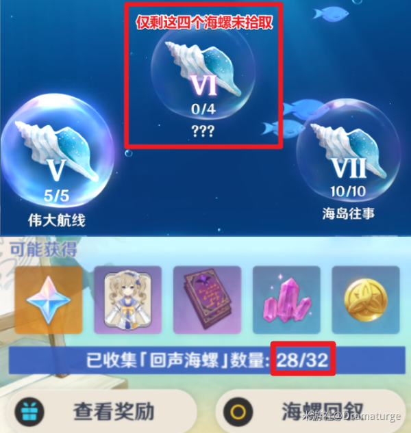 (3)本文把所有海螺的名字都列出了,如果你仅缺少某个海螺,可以去活动页面看你缺的海螺序号,去文中直接找对应海螺。比如你没有伟大航线里的第三个海螺,可以去文中找标记为“V-伟大航线(3)-月亮与风向”的海螺。