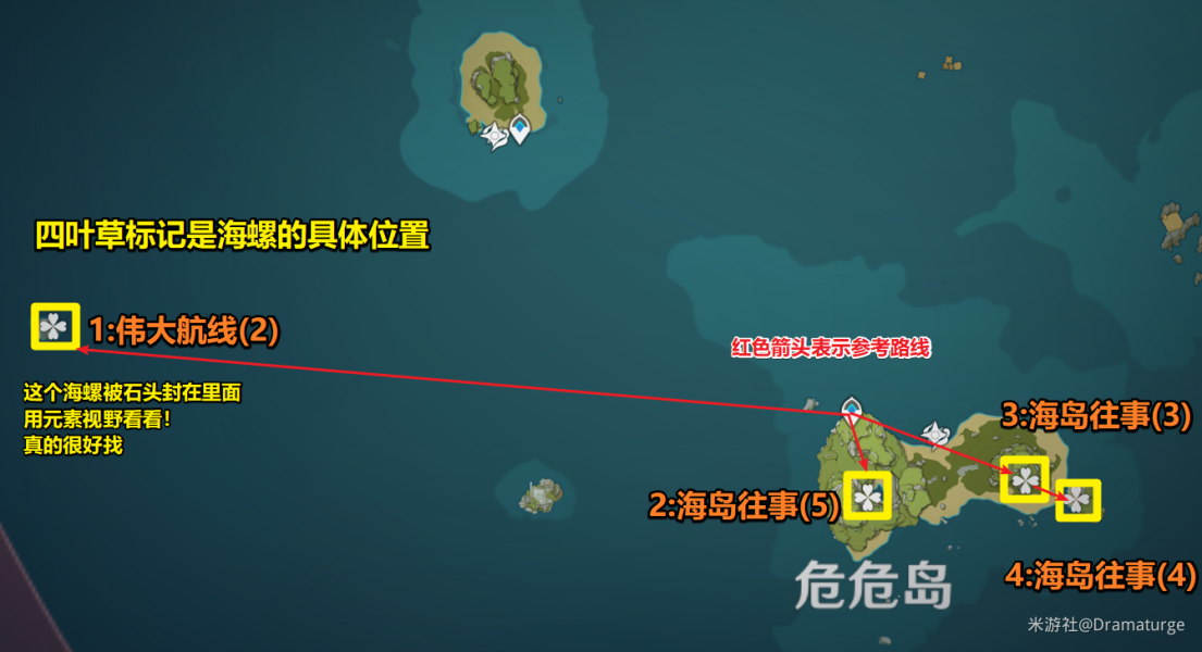 *图中红色箭头表示路线;四叶草标记是海螺位置