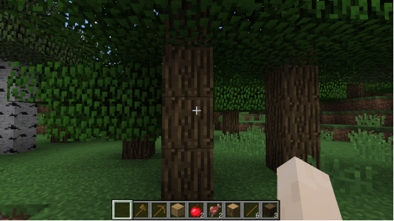 我们只需要将准星对准我们要开采的木头,按住鼠标/屏幕,方块会碎裂,等到它完全碎裂之后,就可以获得开采下来的方块了。所以我们在一阵殴打之后可以获得一块原木。