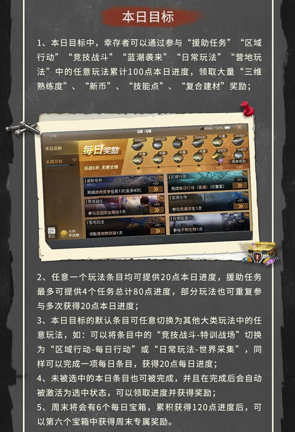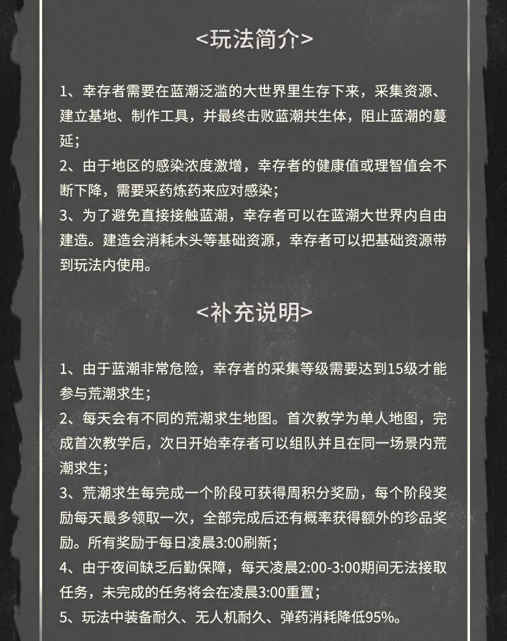 曾经赖以生存的秩序和设施全部瘫痪,玩家将作为幸存者加入营地,与营地盟友一同在废墟中求生。你们将共同为营地捐献资源,升级营地科技树,解锁更高级的制造技能;也将分头行动,术业有专攻,选择不同的生存天赋(如采集、制造、战斗等),成为某方面专家相互交易与支援;还将一起对抗来自其他营地玩家的侵略抢劫,携手活到下一个明天!